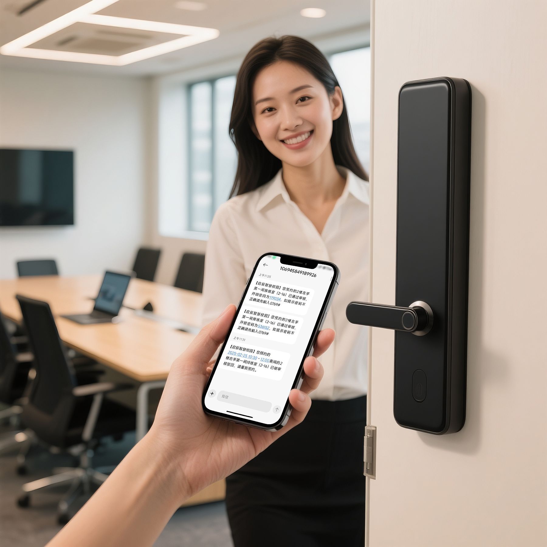 这款门锁采用先进的物联网技术,安装4节5号电池即可自动联网使用(NB-IOT/4G/WIFI),无需繁琐的布线与调试工作。当员工成功预约会议室后,系统会自动生成一个唯一的临时密码,并通过短信或邮件发送给预约者。预约者到达会议室后,只需输入临时密码即可开锁进入,无需携带或传递实体钥匙,大大降低了钥匙丢失的风险。