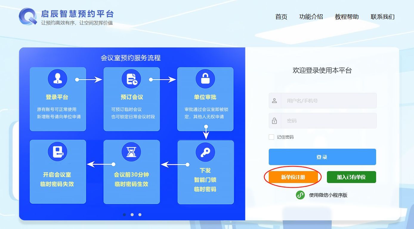 1)登录“启辰智慧预约”平台(网页/小程序均可)并注册单位账号