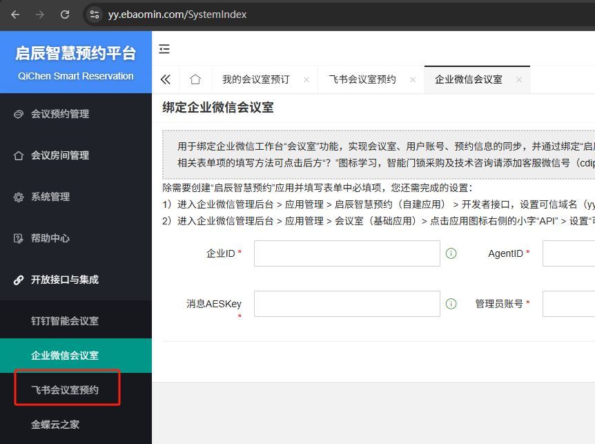 将以上信息复制到“启辰智慧预约”-“开放接口与集成”-“飞书会议室预约”界面的对应位置,保存即可。