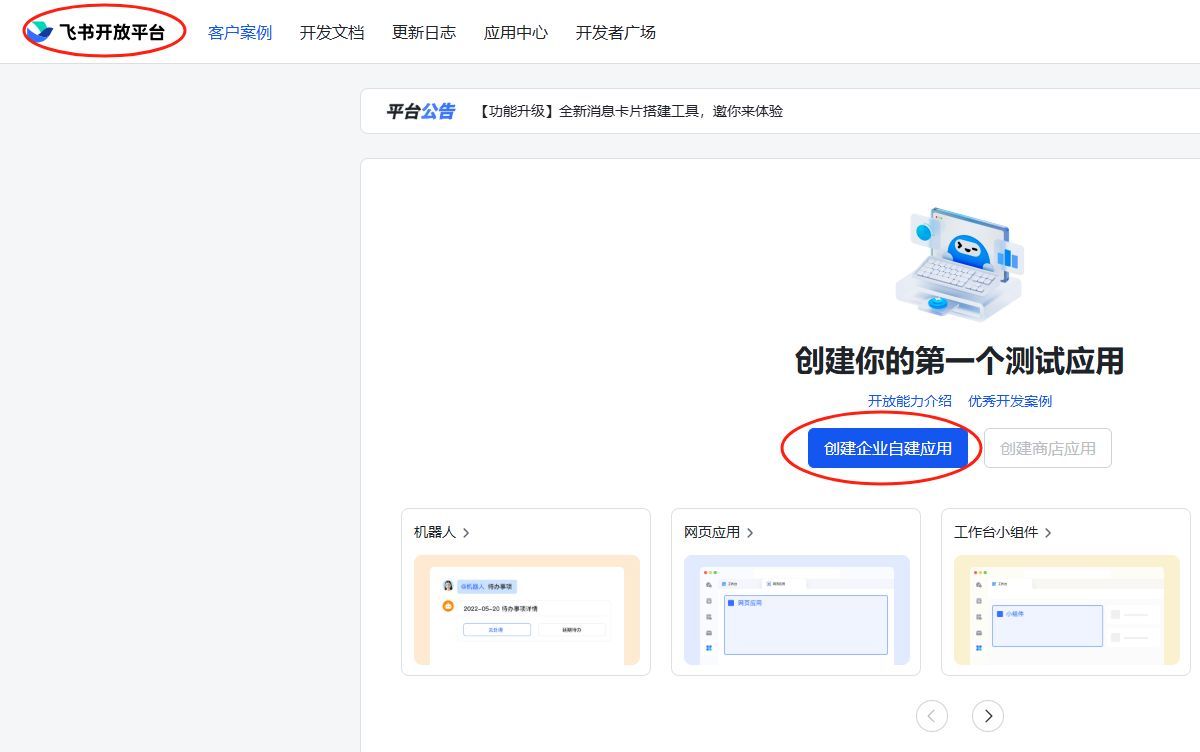 按照集成步骤指引,在《飞书开放平台》中创建应用(用于绑定会议室预约记录和智能门锁,并通过飞书消息发送会议室临时开锁密码)。