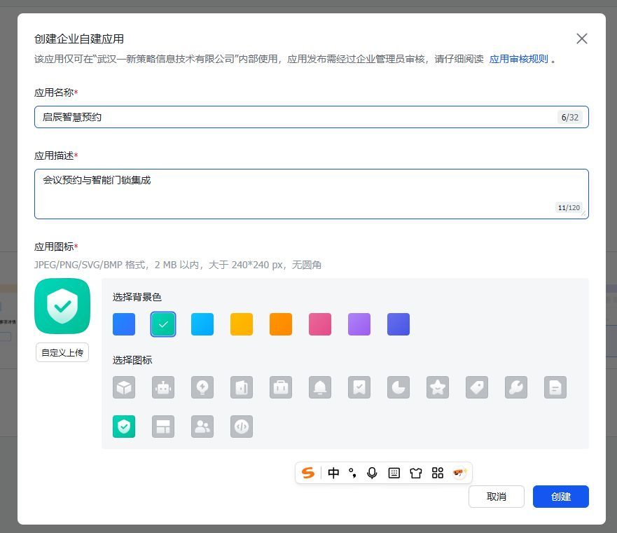 点击“创建企业自建应用”,应用名称为“启辰智慧预约”,应用描述为“会议预约与智能门锁集成”。