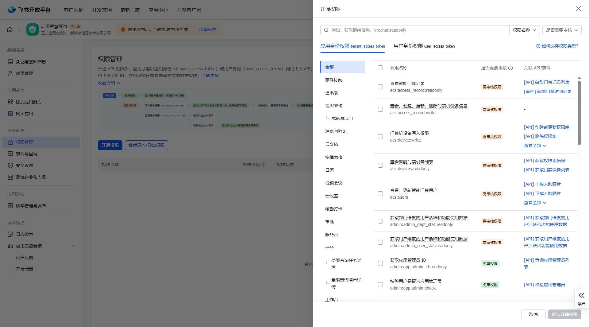为应用添加权限(左侧菜单-开发配置权限管理)