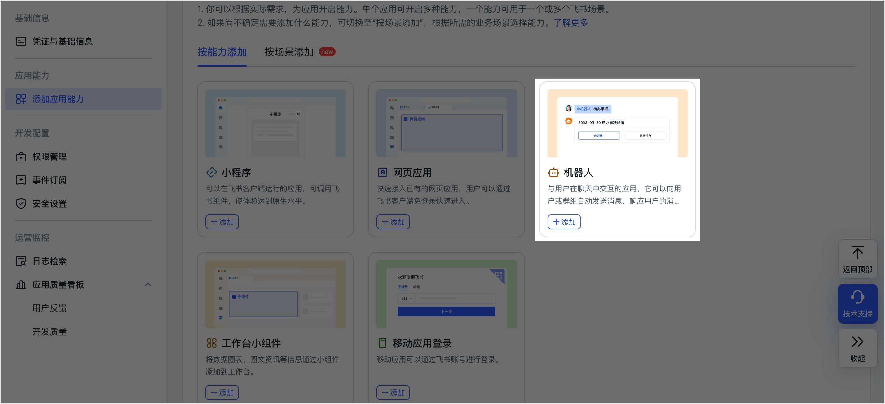 在开发者后台应用管理页面,在 应用能力 > 添加应用能力 页面的 按能力添加 页签,找到 机器人 卡片,并点击 添加