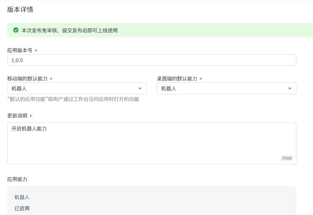 在 版本详情 页面,填写应用版本号、更新说明,确定应用可见范围,然后点击 保存