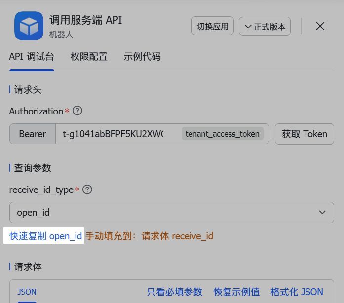 在调试台窗口receive_id_type 参数中,选择 open_id 作为用户 ID 的类型,然后单击 快速复制 open_id。