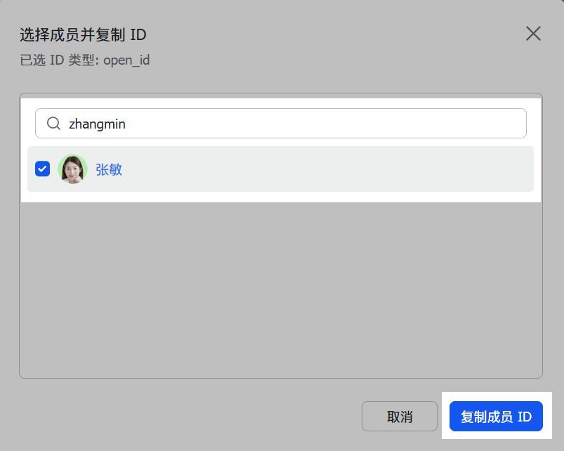 在复制 ID 弹窗中,搜索你自己的姓名(即应用的创建者。默认只有应用创建者在应用可用范围内),然后单击 复制成员 ID。