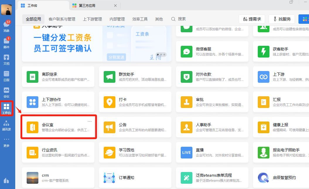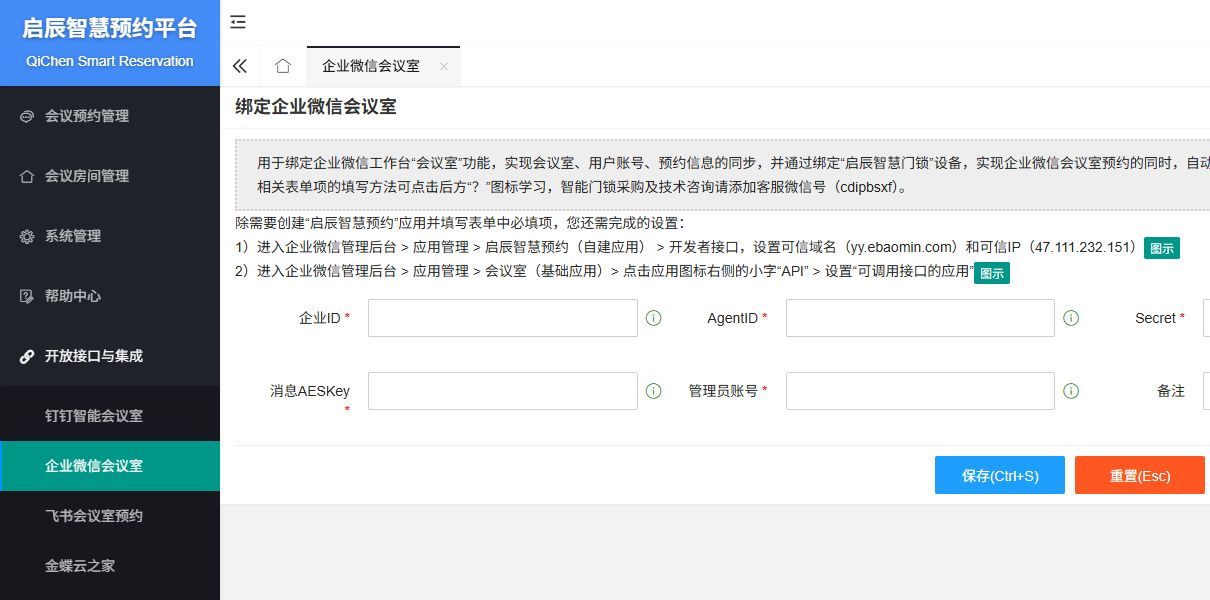 登录后进入:开放接口与集成 > 企业微信会议室,按提示与企业微信进行绑定,这一步也可以联系启辰智慧预约平台的技术人员进行远程协助或指导。
