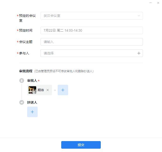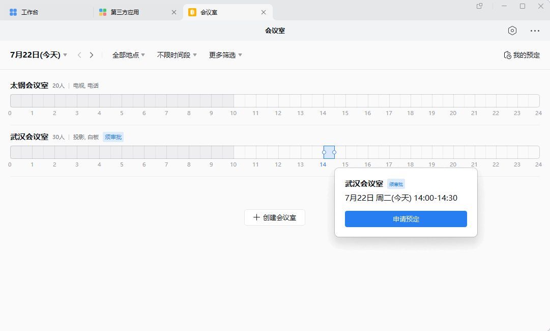 可按时间、位置筛选可用会议室。若会议室标注“需审批”,需提交申请后等待管理员审核。