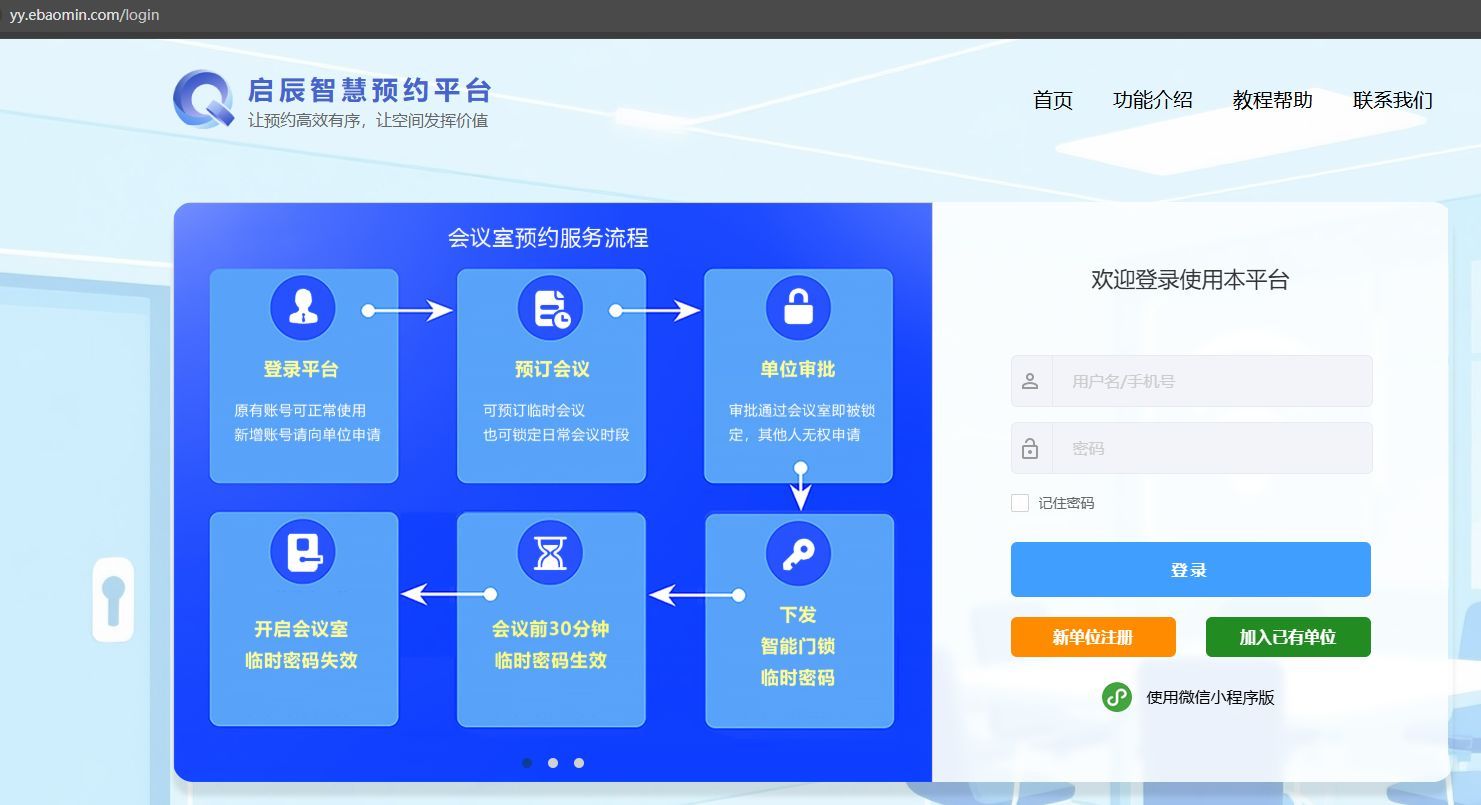 进入“启辰智慧预约”管理后台(yy.ebaomin.com),注册单位账号并登录