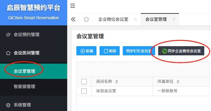 再次进入启辰智慧预约后台 > 会议房间管理 > 会议室管理,同步企业微信会议室,即可将企业微信中的会议室自动同步过来。