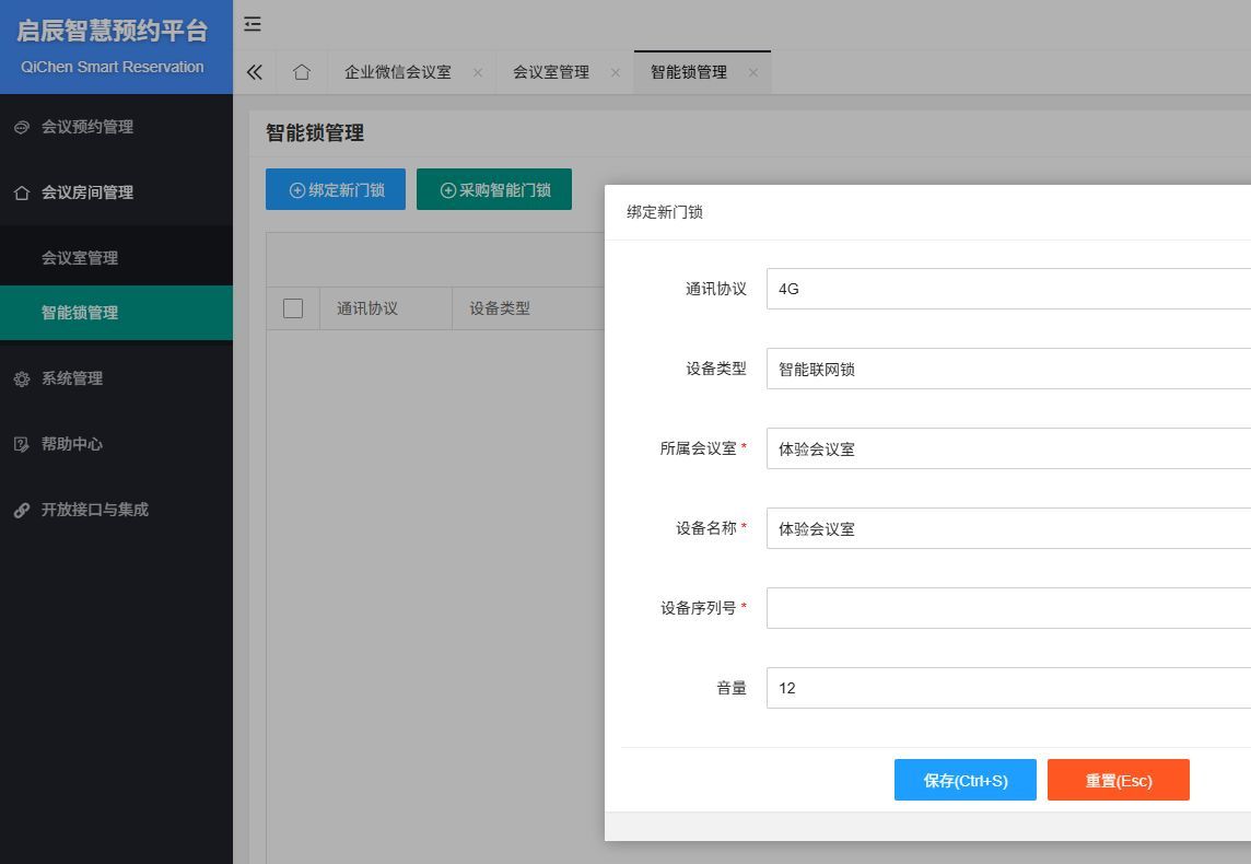 进入启辰智慧预约后台 > 会议房间管理 > 智能锁管理,登记智能门锁上的序列号即可(已采购并完成智能门锁安装,详见启辰智慧预约 > 智能锁管理 > 采购)。