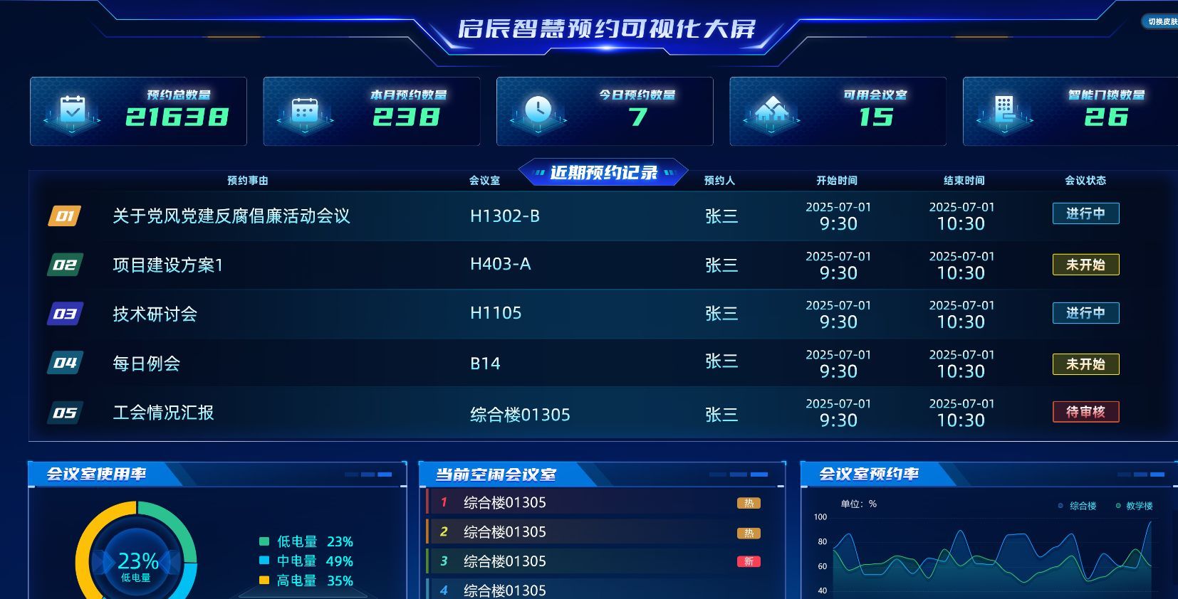 可以在启辰智慧预约后台查看详细的会议室预约记录、房间使用率等指标。