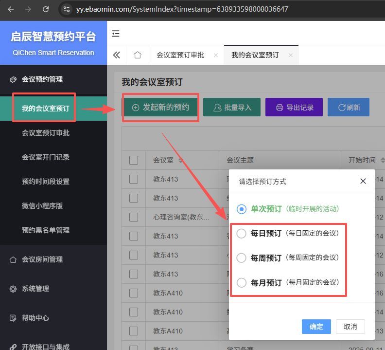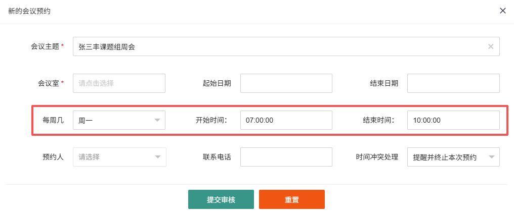 针对周期性会议,例如公司周会、班级班会、课题组组会等,可以选择相应的周期类型,一次性完成全年或学期的会议室批量占用预定。