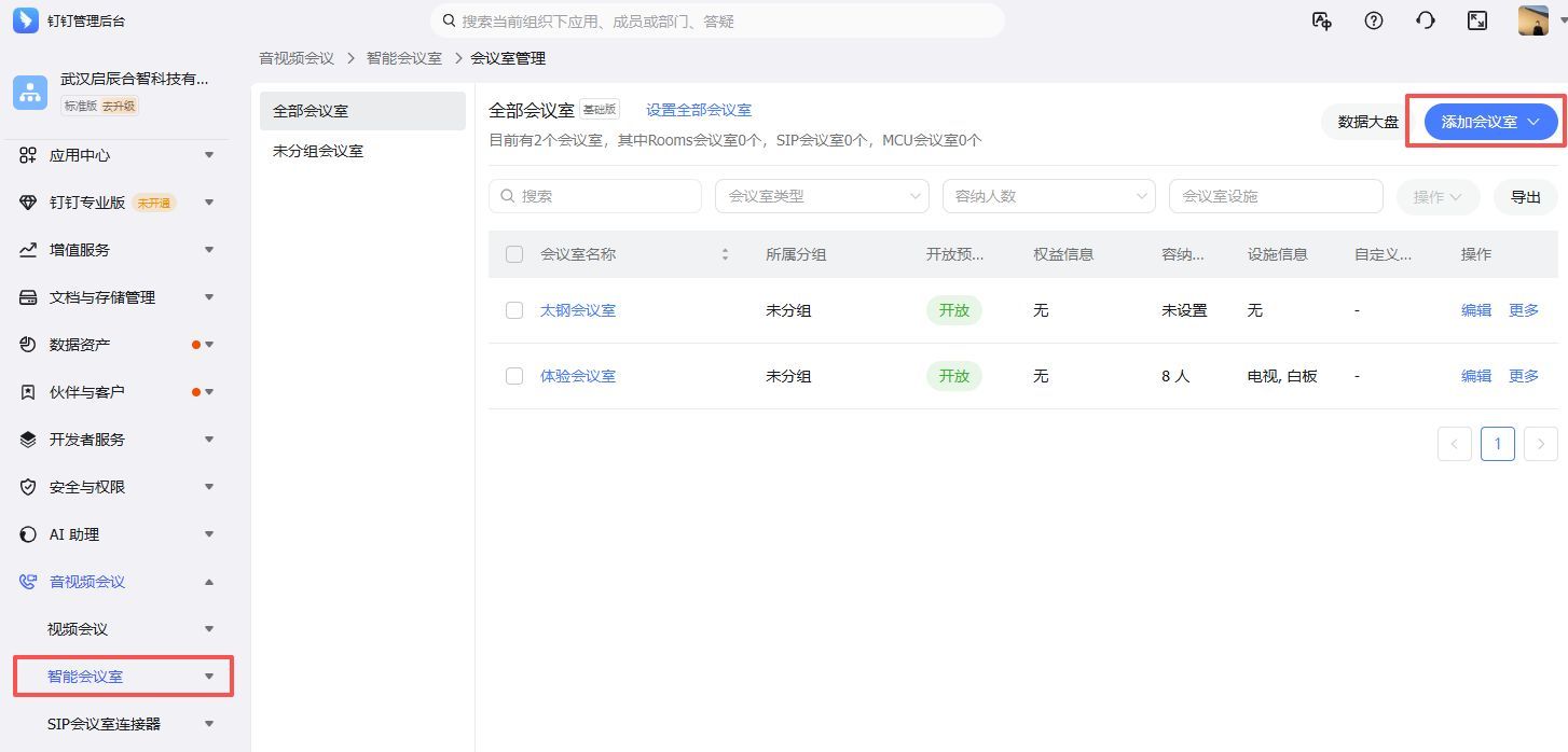 在钉钉管理后台-音视频会议-智能会议室,点击右上角蓝色按钮”添加会议室“,创建您单位可供预约的会议室。
