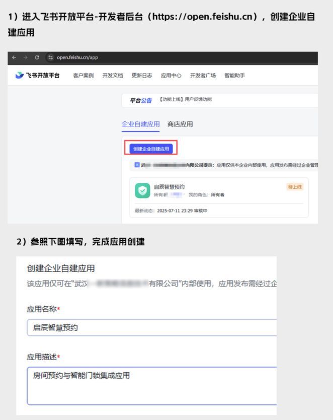 1、首先在飞书中创建”启辰智慧预约“应用。进入”飞书开放平台“,使用单位管理员账号登录后,进入”开发者后台“,创建一个应用,并命名为”启辰智慧预约“。