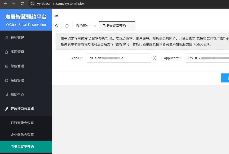 3、粘贴到【启辰智慧预约管理后台-开放接口与集成-飞书会议室预约】对应位置并保存即可。