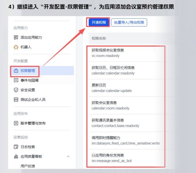 4、继续在飞书开发着后台中,为刚创建的应用添加权限,包括: