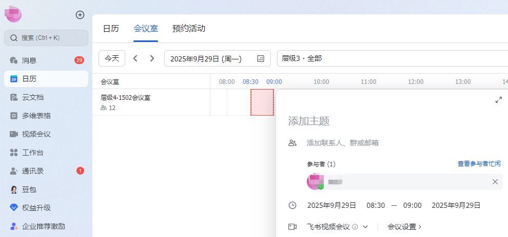 7、为了方便测试,创建一个飞书会议室并在飞书中发起一个预约