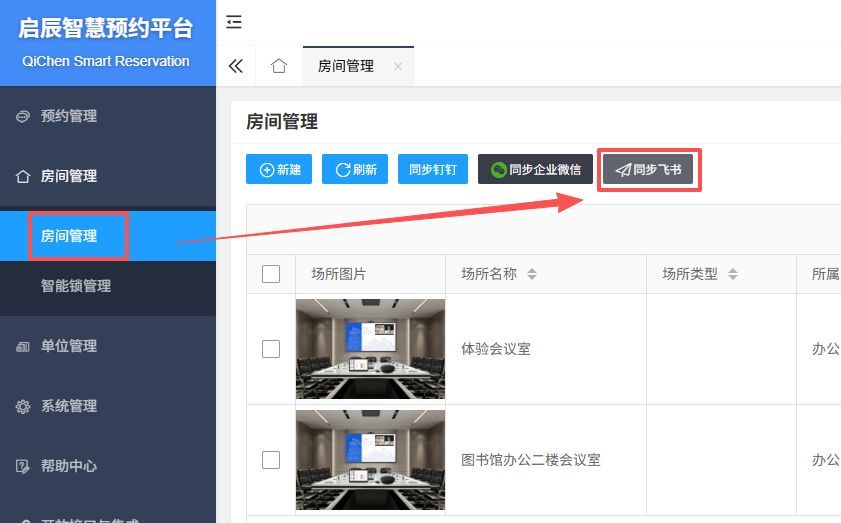 8、进入【启辰智慧预约】网页版管理后台,使用会议管理员账号登录,并进入【房间管理】,点击【同步飞书】,即可将飞书中的会议室同步下来。