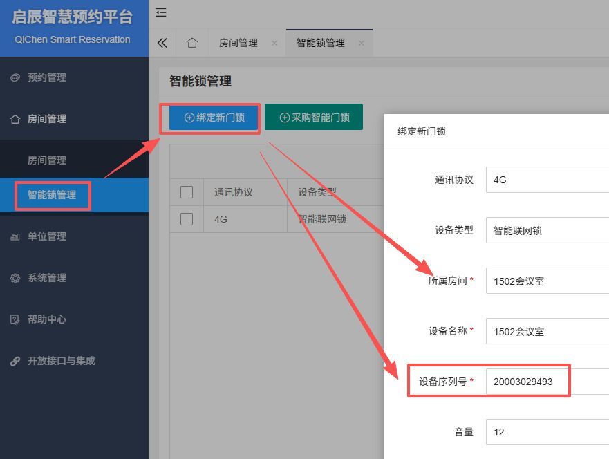 9、继续进入【房间管理-智能锁管理】,将安装的启辰智慧预约门锁侧面的序列号填入