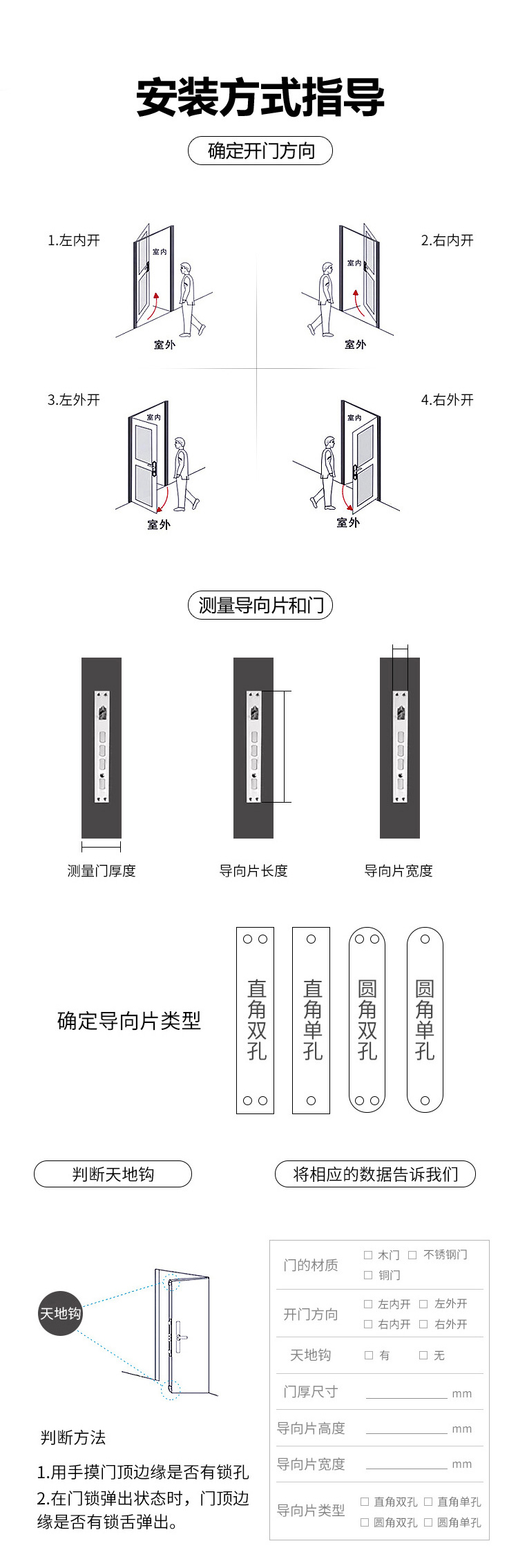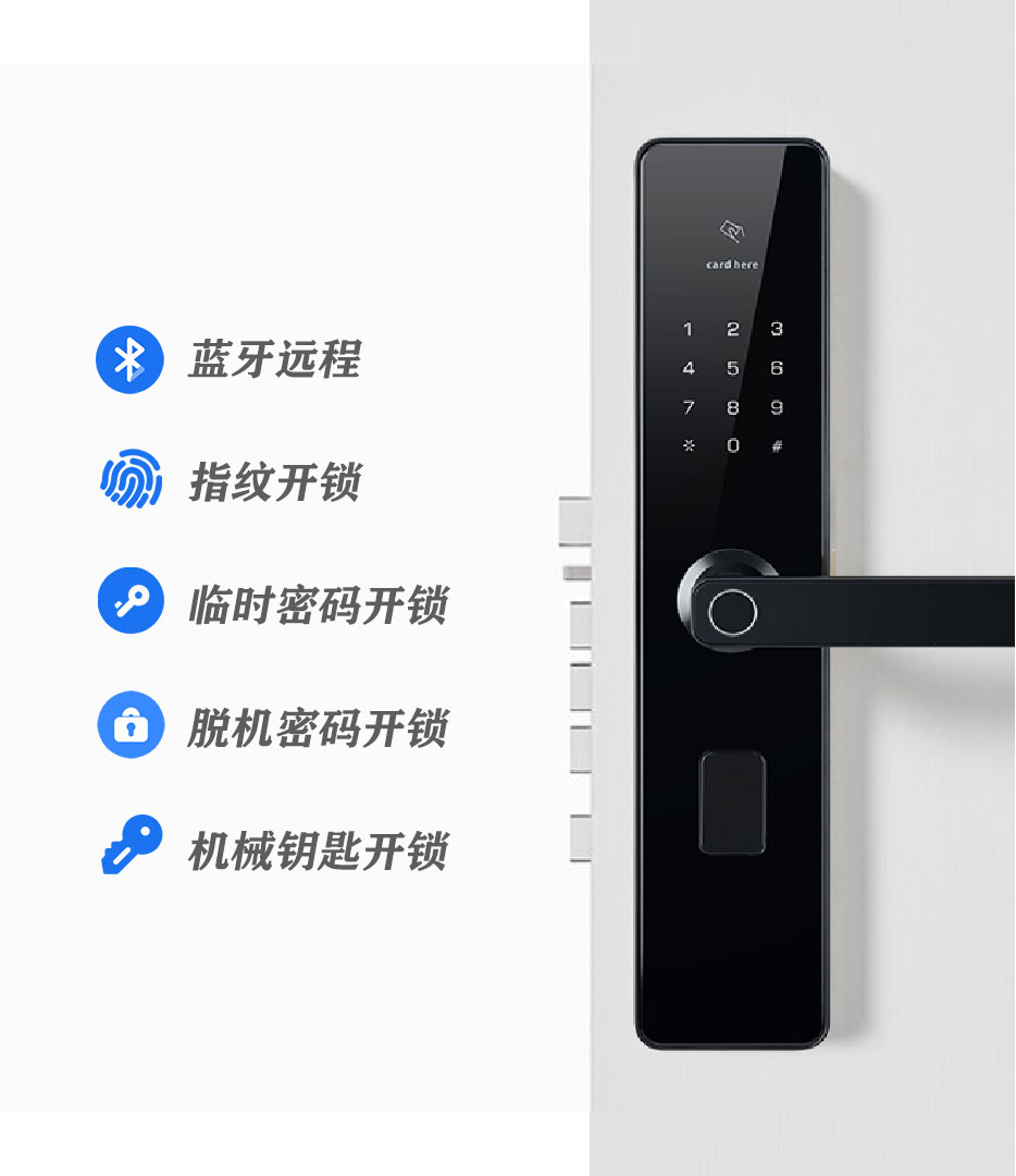 3、支持木门/玻璃门/防盗门/推拉门/断桥铝等门型,支持机械钥匙、蓝牙、指纹、密码开锁,使用场景灵活,无需担心无法开锁。